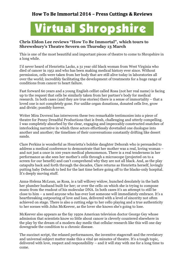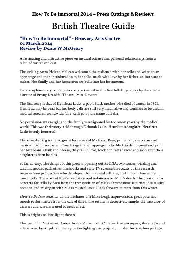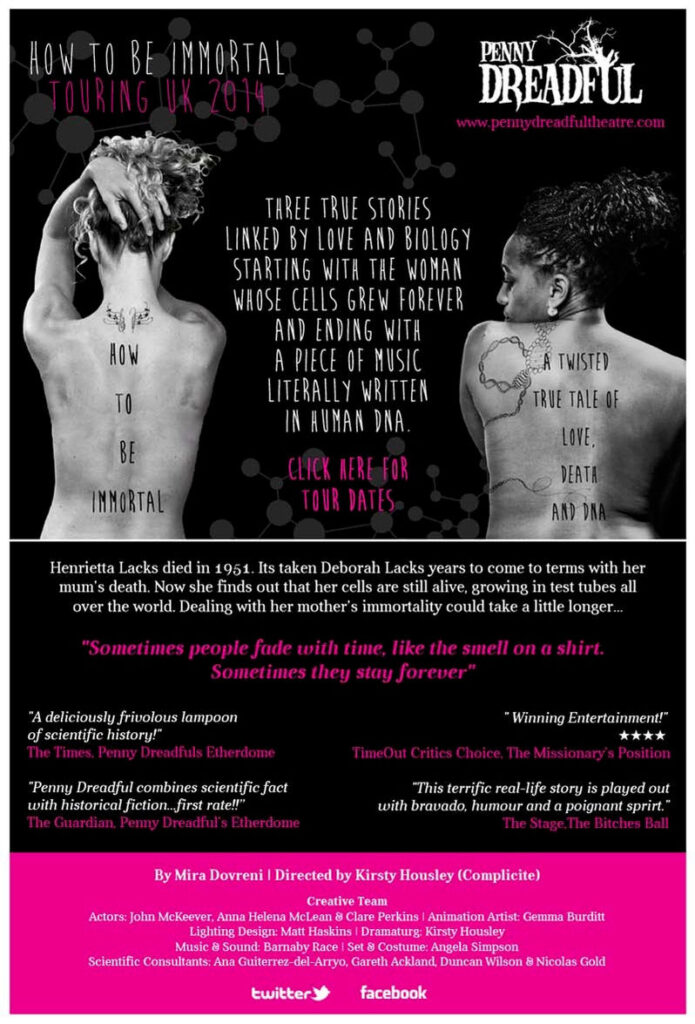 My first full length play was inspired by the life of Henrietta Lacks, whose immortal cells helped code human DNA and find a cure for too many diseases to list. But what did her life (and subsequent immortality) mean to the daughter she left behind?